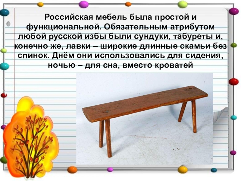 Слайд 19Российская мебель была простой и функциональной. Обязательным атрибутом любой русской избы