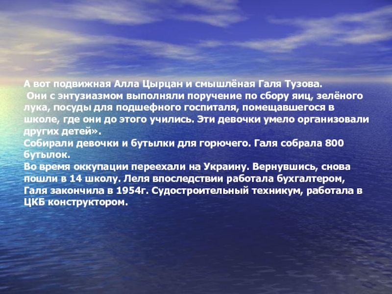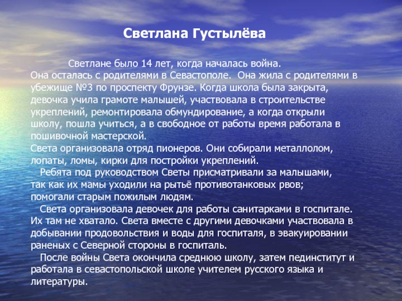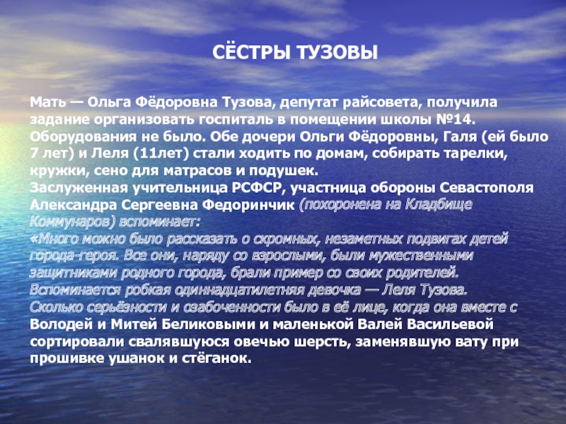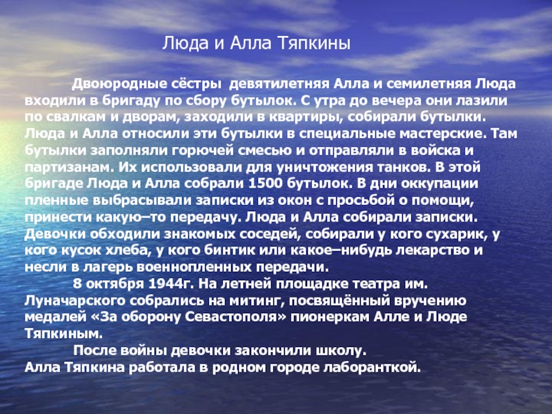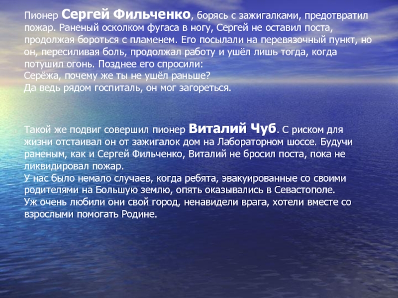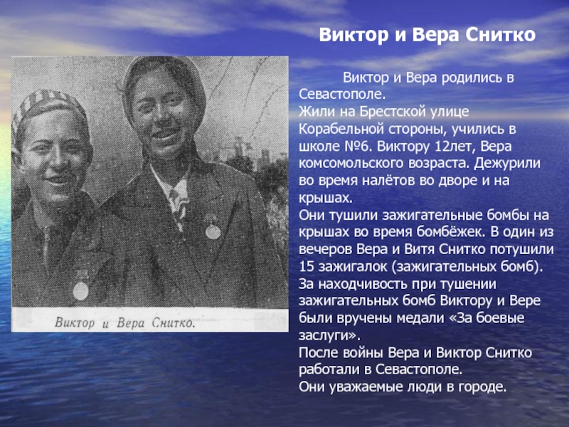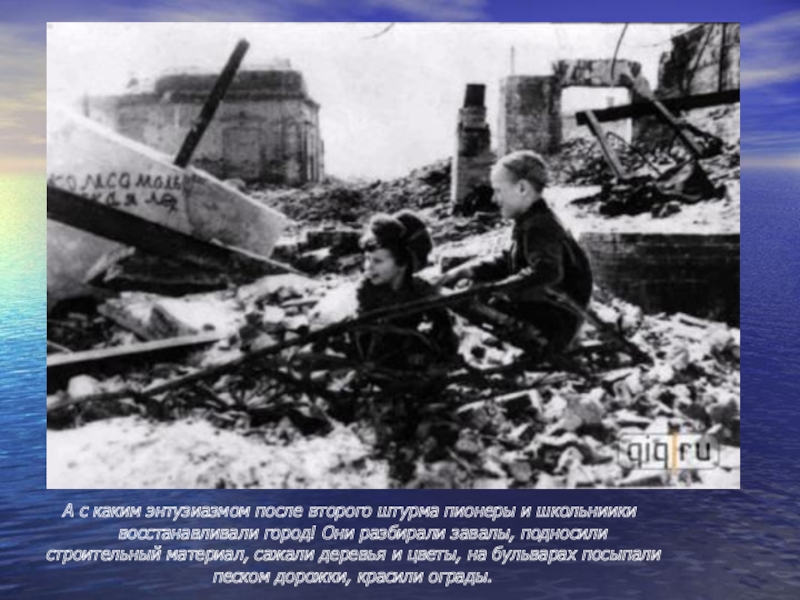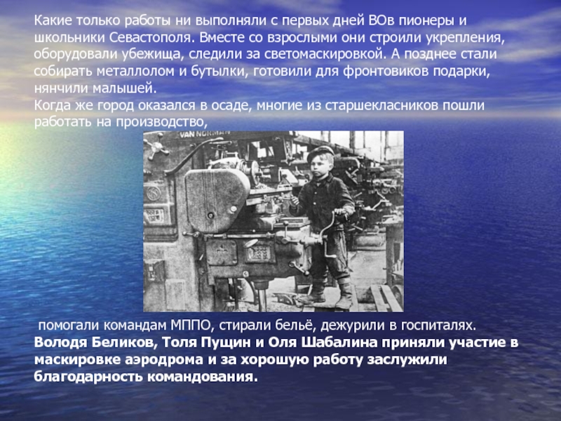 школьники Севастополя. Вместе со взрослыми они строили укрепления, оборудовали убежища, следили за светомаскировкой. А позднее стали собирать металлолом и бутылки, готовили для фронтовиков подарки, нянчили малышей.