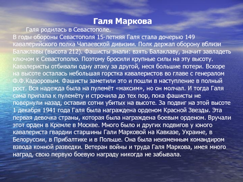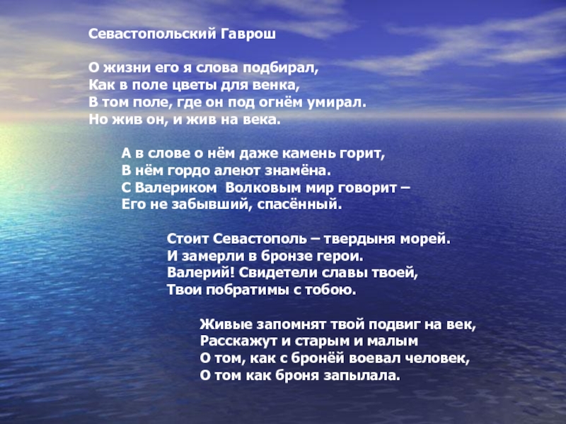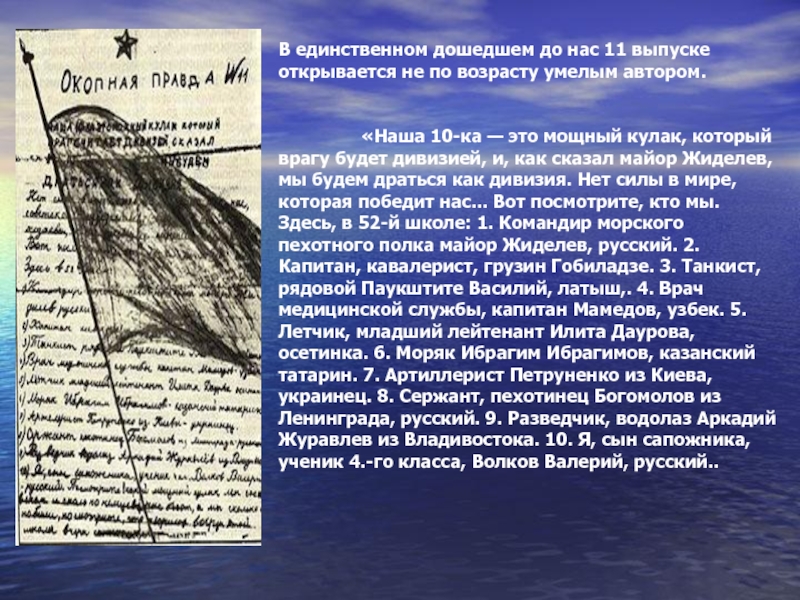 «Наша 10-ка — это мощный кулак, который врагу будет дивизией, и, как сказал майор Жиделев, мы будем драться как дивизия. Нет силы в мире, которая победит нас... Вот посмотрите, кто мы. Здесь, в 52-й школе: 1. Командир морского пехотного полка майор Жиделев, русский. 2. Капитан, кавалерист, грузин Гобиладзе. 3. Танкист, рядовой Паукштите Василий, латыш,. 4. Врач медицинской службы, капитан Мамедов, узбек. 5. Летчик, младший лейтенант Илита Даурова, осетинка. 6. Моряк Ибрагим Ибрагимов, казанский татарин. 7. Артиллерист Петруненко из Киева, украинец. 8. Сержант, пехотинец Богомолов из Ленинграда, русский. 9. Разведчик, водолаз Аркадий Журавлев из Владивостока. 10. Я, сын сапожника, ученик 4.-го класса, Волков Валерий, русский..