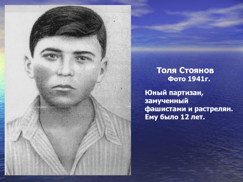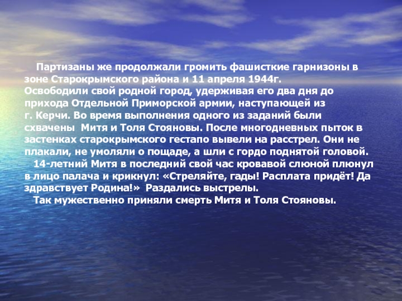 г. Керчи. Во время выполнения одного из заданий были схвачены Митя и Толя Стояновы. После многодневных пыток в застенках старокрымского гестапо вывели на расстрел. Они не плакали, не умоляли о пощаде, а шли с гордо поднятой головой.