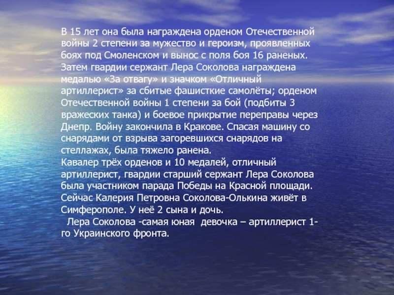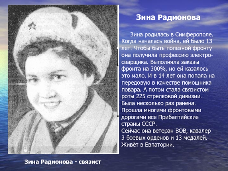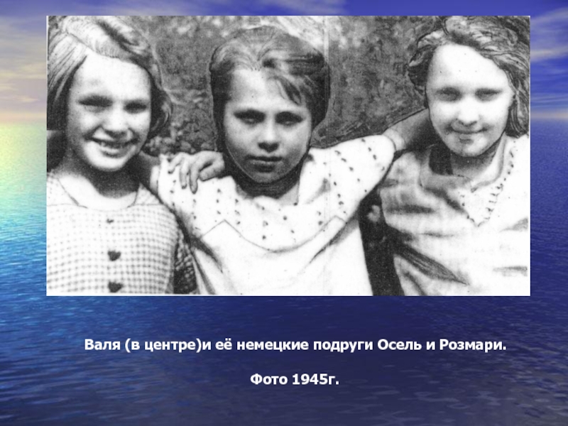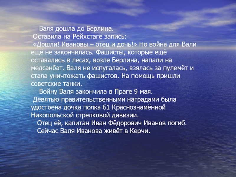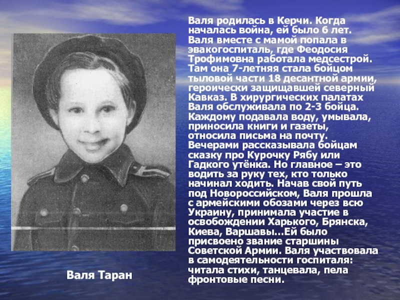 Валя родилась в Керчи. Когда началась война, ей было 6 лет. Валя вместе с мамой попала в эвакогоспиталь, где Феодосия Трофимовна работала медсестрой. Там она 7-летняя стала бойцом тыловой части 18 десантной армии, героически защищавшей северный Кавказ. В хирургических палатах Валя обслуживала по 2-3 бойца. Каждому подавала воду, умывала, приносила книги и газеты, относила письма на почту. Вечерами рассказывала бойцам сказку про Курочку Рябу или Гадкого утёнка. Но главное – это водить за руку тех, кто только начинал ходить. Начав свой путь под Новороссийском, Валя прошла с армейскими обозами через всю Украину, принимала участие в освобождении Харького, Брянска, Киева, Варшавы…Ей было присвоено звание старшины Советской Армии. Валя участвовала в самодеятельности госпиталя: читала стихи, танцевала, пела фронтовые песни.
