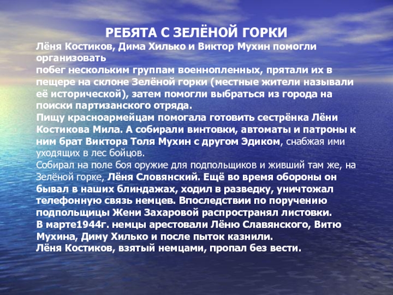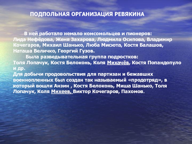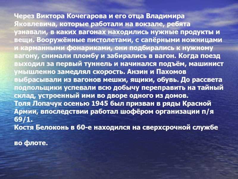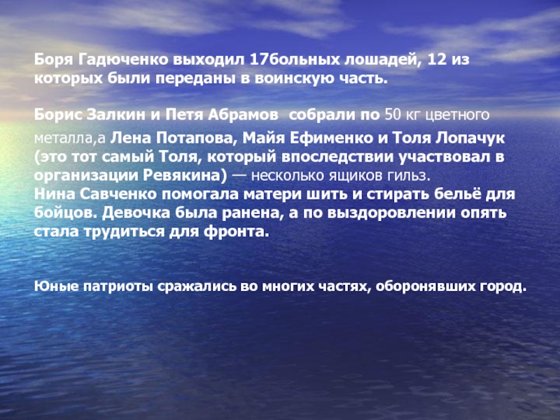 Борис Залкин и Петя Абрамов собрали по 50 кг цветного металла,а Лена Потапова, Майя Ефименко и Толя Лопачук (это тот самый Толя, который впоследствии участвовал в организации Ревякина) — несколько ящиков гильз.