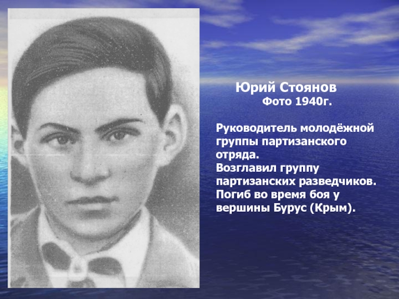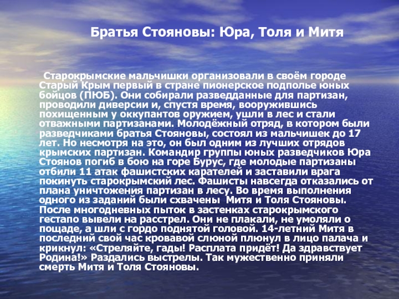 Старокрымские мальчишки организовали в своём городе Старый Крым первый в стране пионерское подполье юных бойцов (ПЮБ). Они собирали разведданные для партизан, проводили диверсии и, спустя время, вооружившись похищенным у оккупантов оружием, ушли в лес и стали отважными партизанами. Молодёжный отряд, в котором были разведчиками братья Стояновы, состоял из мальчишек до 17 лет. Но несмотря на это, он был одним из лучших отрядов крымских партизан. Командир группы юных разведчиков Юра Стоянов погиб в бою на горе Бурус, где молодые партизаны отбили 11 атак фашистских карателей и заставили врага покинуть старокрымский лес. Фашисты навсегда отказались от плана уничтожения партизан в лесу. Во время выполнения одного из заданий были схвачены Митя и Толя Стояновы. После многодневных пыток в застенках старокрымского гестапо вывели на расстрел. Они не плакали, не умоляли о пощаде, а шли с гордо поднятой головой. 14-летний Митя в последний свой час кровавой слюной плюнул в лицо палача и крикнул: «Стреляйте, гады! Расплата придёт! Да здравствует Родина!» Раздались выстрелы. Так мужественно приняли смерть Митя и Толя Стояновы.