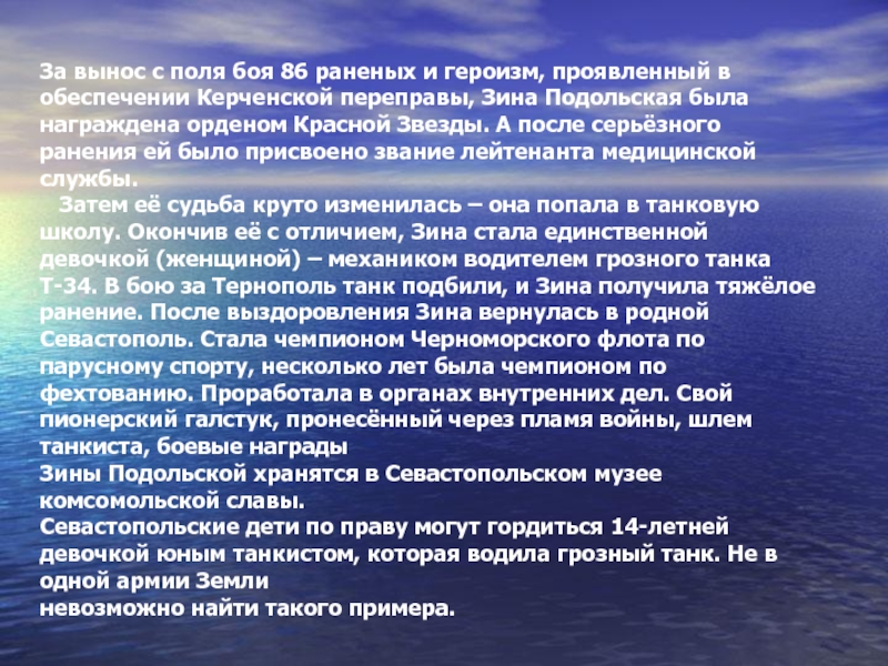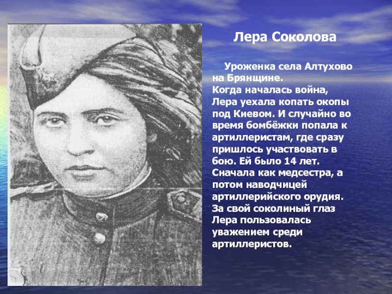 Нина Савченко помогала матери шить и стирать бельё для бойцов. Девочка была ранена, а по выздоровлении опять стала трудиться для фронта.