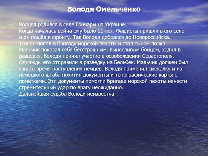 смерти отца (убитого фашистами), в 13 лет (по другим данным в 14) становится «сыном полка» 7-ой бригады морской пехоты. Наравне со взрослыми участвует в боевых действиях. Подносит патроны, добывает разведывательные данные, с оружием в руках сдерживает атаки врага.