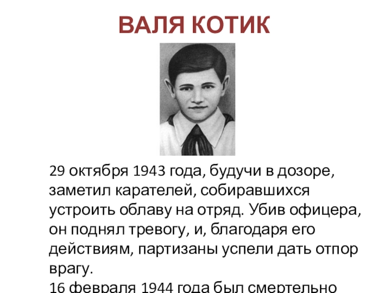 ВАЛЯ КОТИК  29 октября 1943 года, будучи в дозоре, заметил карателей, собиравшихся устроить облаву на отряд.