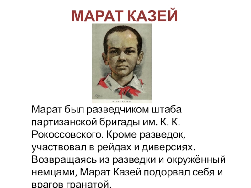 МАРАТ КАЗЕЙ  Марат был разведчиком штаба партизанской бригады им. К. К. Рокоссовского. Кроме разведок, участвовал в
