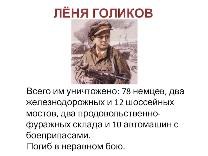ЛЁНЯ ГОЛИКОВ  Всего им уничтожено: 78 немцев, два железнодорожных и 12 шоссейных мостов, два продовольственно-фуражных склада