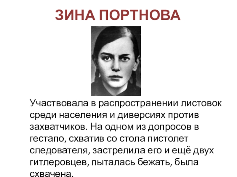 ЗИНА ПОРТНОВА  Участвовала в распространении листовок среди населения и диверсиях против захватчиков. На одном из допросов