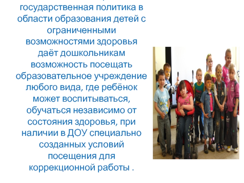 возможностями здоровья даёт дошкольникам возможность посещать образовательное учреждение любого вида, где ребёнок может воспитываться, обучаться независимо от состояния здоровья, при наличии в ДОУ специально созданных условий посещения для коррекционной работы .