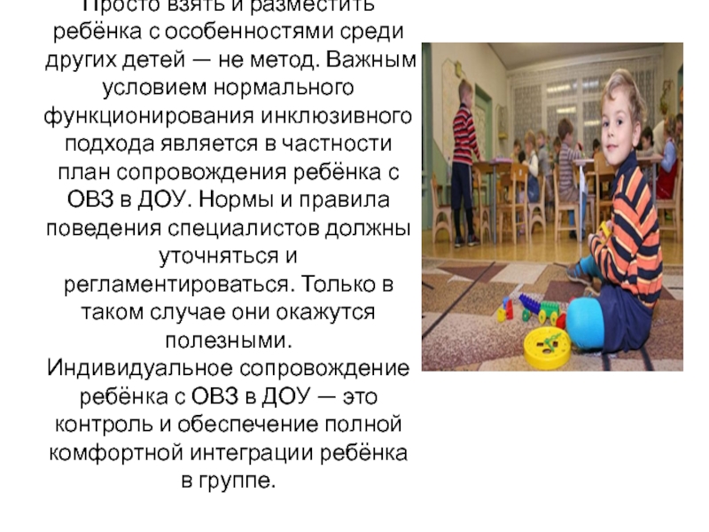 Слайд 12Просто взять и разместить ребёнка с особенностями среди других детей —