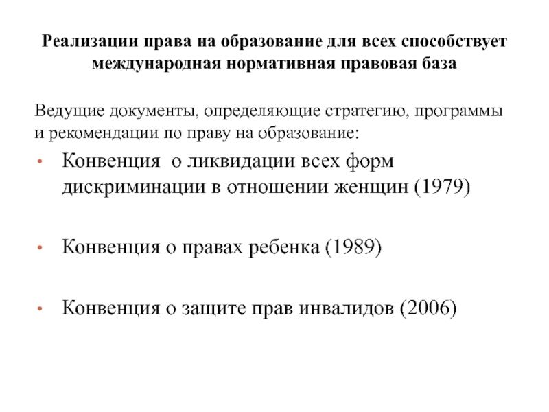 Слайд 8Реализации права на образование для всех способствует международная нормативная правовая база