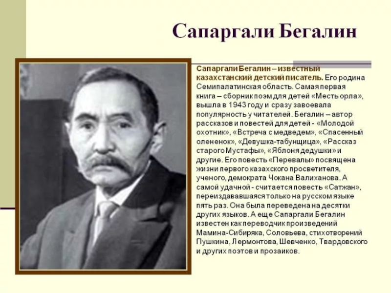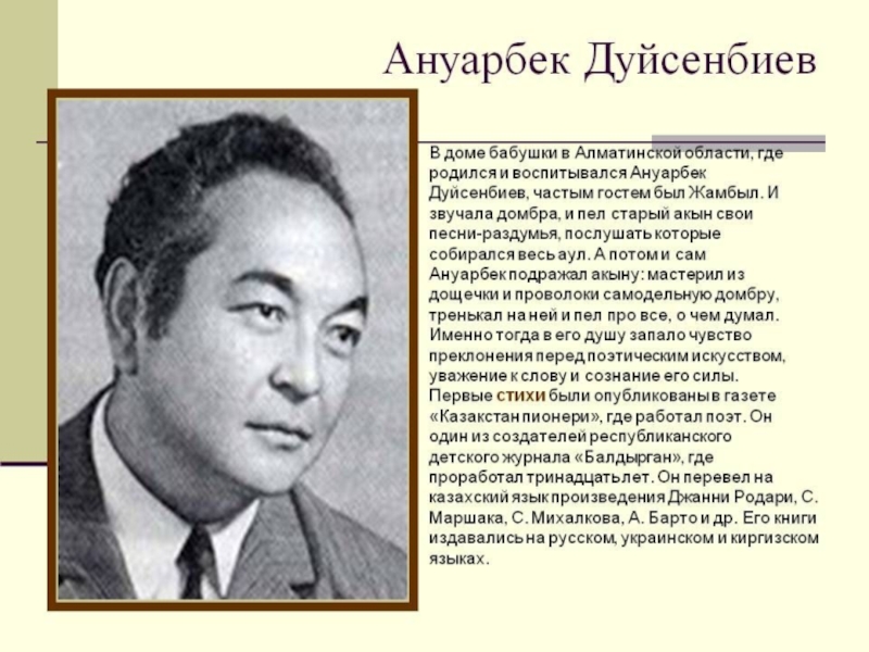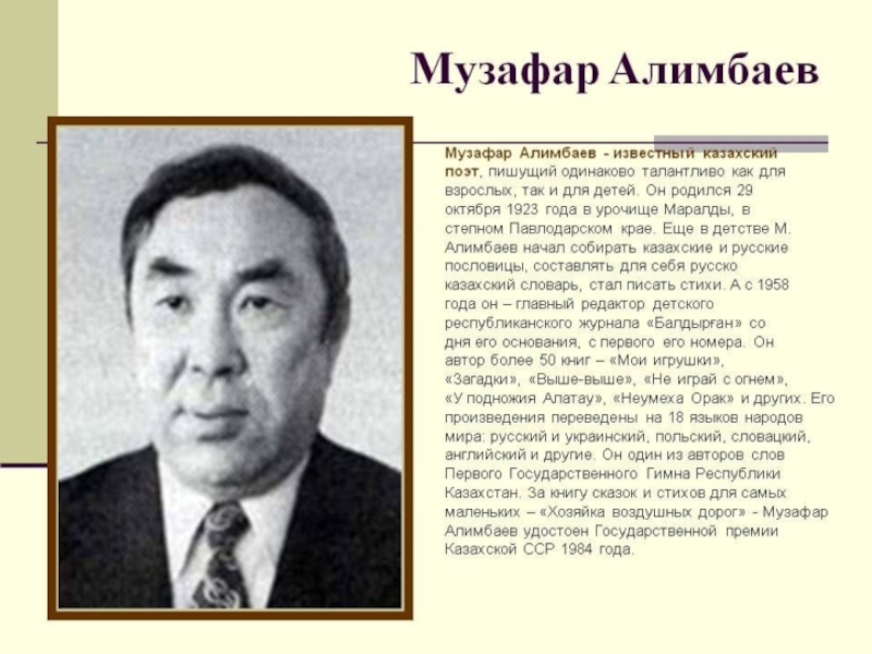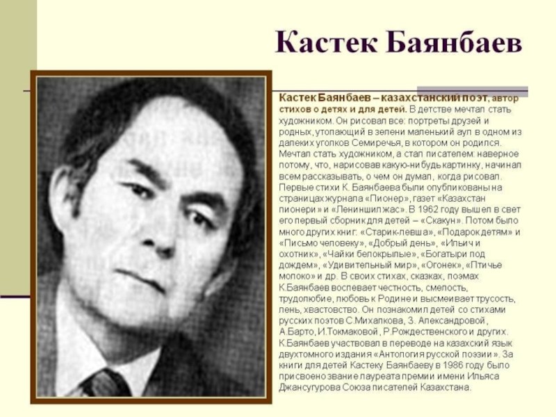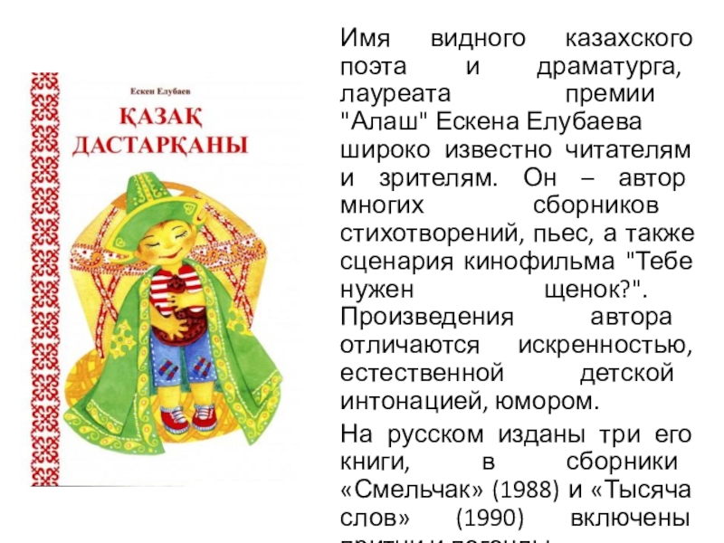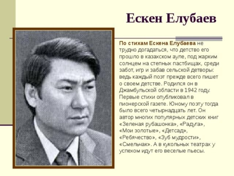 Слайд 20Имя видного казахского поэта и драматурга, лауреата премии "Алаш" Ескена Елубаева широко известно