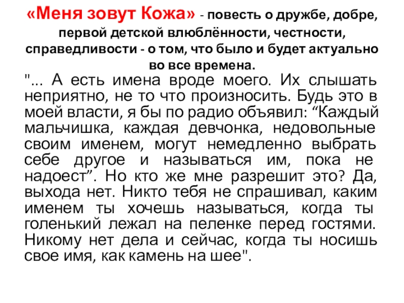Слайд 15«Меня зовут Кожа» - повесть о дружбе, добре, первой детской влюблённости,