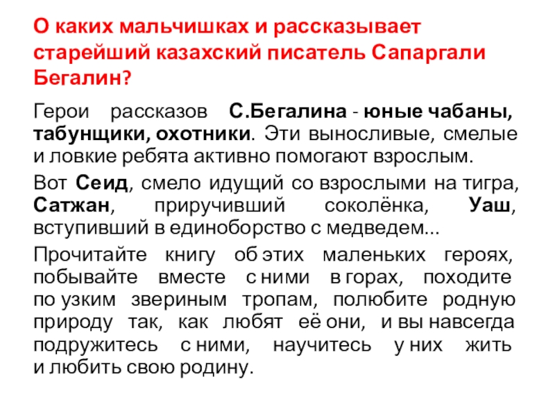 Слайд 12О каких мальчишках и рассказывает старейший казахский писатель Сапаргали Бегалин?