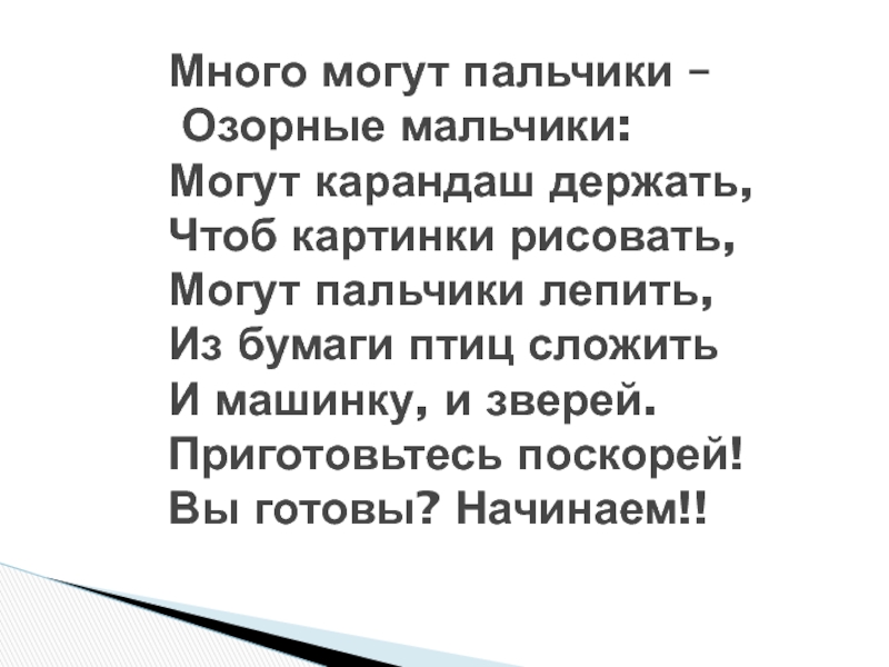 Много могут пальчики – Озорные мальчики: Могут карандаш держать, Чтоб картинки рисовать, Могут пальчики лепить, Из бумаги птиц сложить И машинку, и зверей. Приготовьтесь поскорей! Вы готовы? Начинаем!!