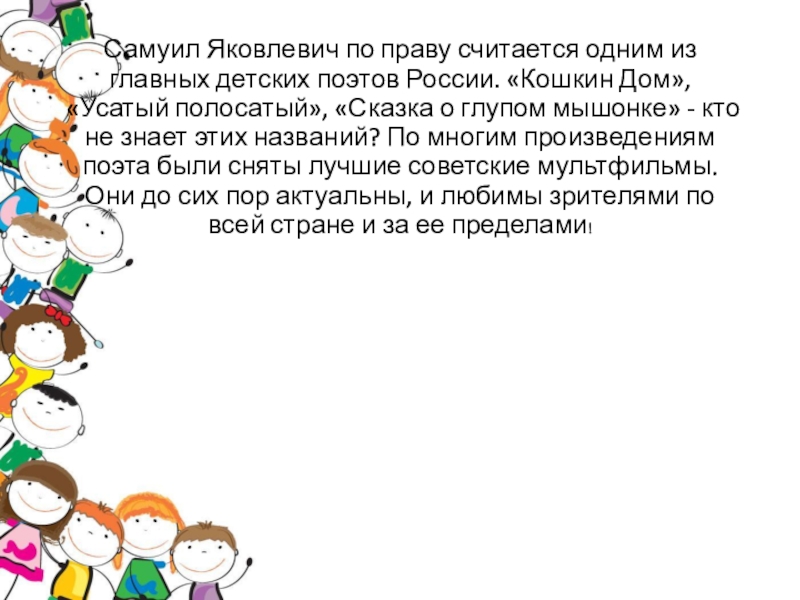 Слайд 11Самуил Яковлевич по праву считается одним из главных детских поэтов России.