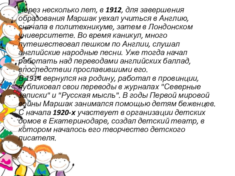 Слайд 6Через несколько лет, в 1912, для завершения образования Маршак уехал учиться