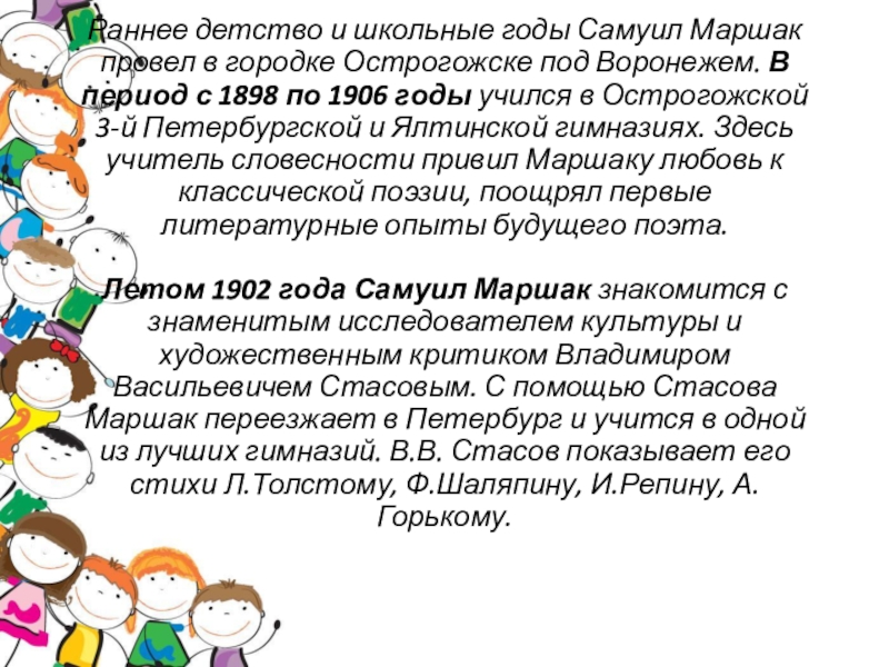 Летом 1902 года Самуил Маршак знакомится с знаменитым исследователем культуры и художественным критиком Владимиром Васильевичем Стасовым. С помощью Стасова Маршак переезжает в Петербург и учится в одной из лучших гимназий. В.В. Стасов показывает его стихи Л.Толстому, Ф.Шаляпину, И.Репину, А.Горькому.