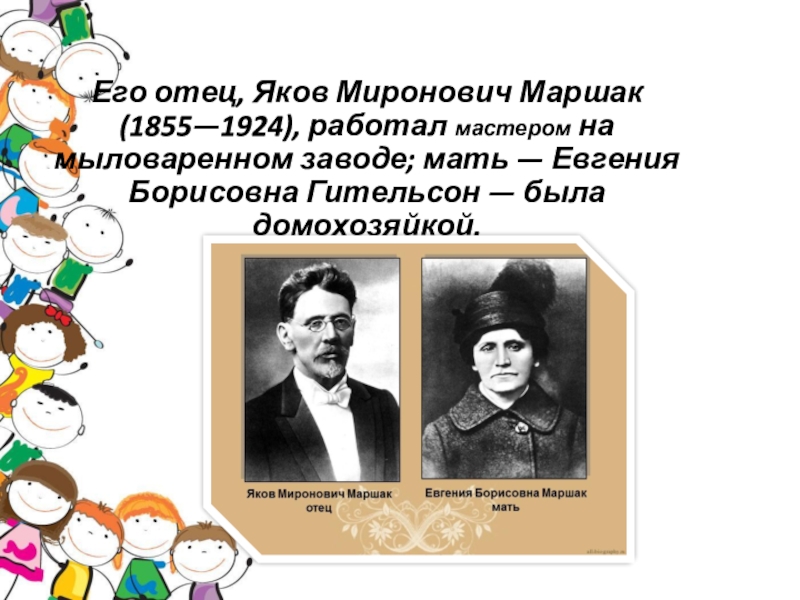 Его отец, Яков Миронович Маршак (1855—1924), работал мастером на мыловаренном заводе;