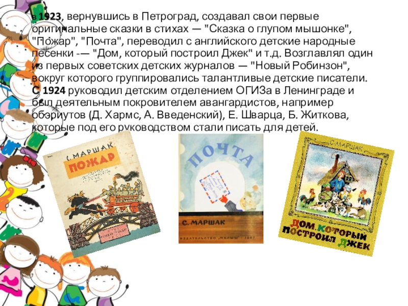 стихах — "Сказка о глупом мышонке", "Пожар", "Почта", переводил с английского детские народные песенки -— "Дом, который построил Джек" и т.д. Возглавлял один из первых советских детских журналов — "Новый Робинзон", вокруг которого группировались талантливые детские писатели. С 1924 руководил детским отделением ОГИЗа в Ленинграде и был деятельным покровителем авангардистов, например обэриутов (Д. Хармс, А. Введенский), Е. Шварца, Б. Житкова, которые под его руководством стали писать для детей.
