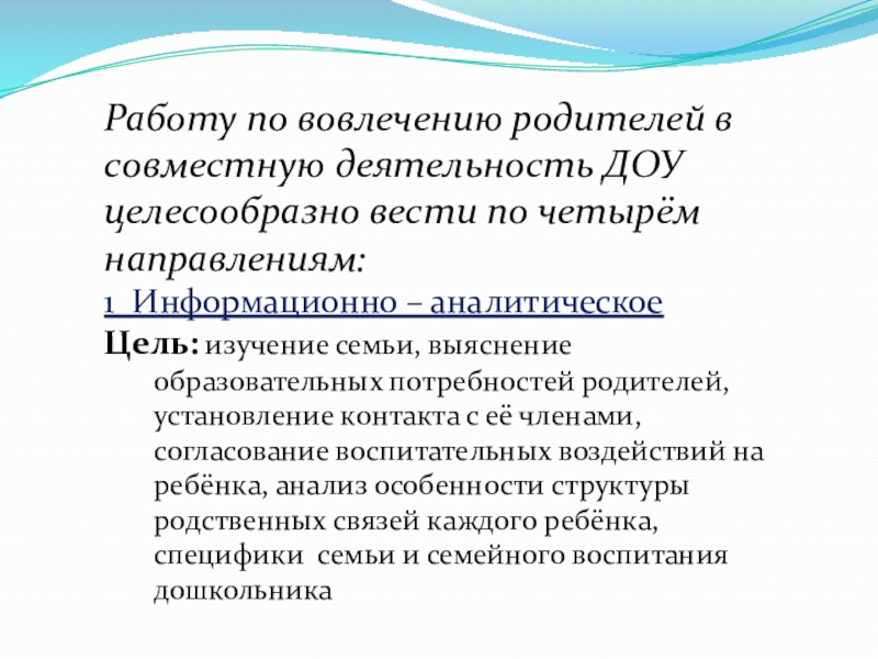 Работу по вовлечению родителей в совместную деятельность ДОУ целесообразно вести по четырём направлениям:1 Информационно – аналитическоеЦель: изучение