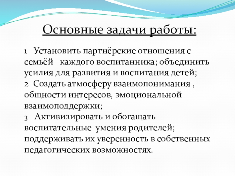 Основные задачи работы:1  Установить партнёрские отношения с семьёй  каждого воспитанника; объединить усилия для развития и