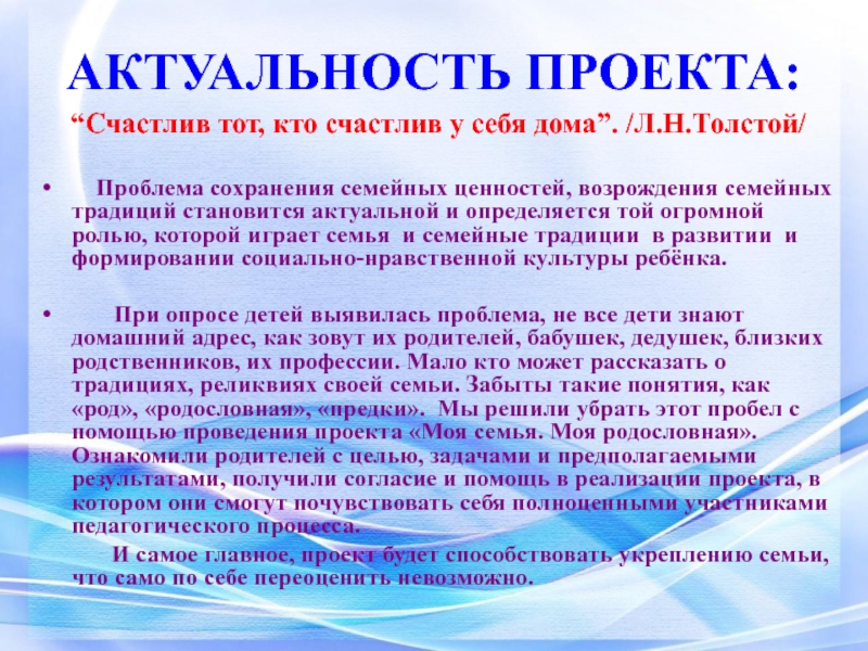 При опросе детей выявилась проблема, не все дети знают домашний адрес, как зовут их родителей, бабушек, дедушек, близких родственников, их профессии. Мало кто может рассказать о традициях, реликвиях своей семьи. Забыты такие понятия, как «род», «родословная», «предки». Мы решили убрать этот пробел с помощью проведения проекта «Моя семья. Моя родословная». Ознакомили родителей с целью, задачами и предполагаемыми результатами, получили согласие и помощь в реализации проекта, в котором они смогут почувствовать себя полноценными участниками педагогического процесса.