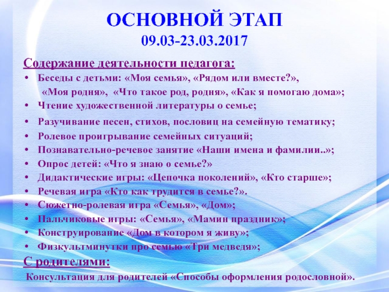 Обсуждение с родителями проекта, выяснение возможностей, средств, необходимых для реализации проекта, определение содержания деятельности всех участников проекта.