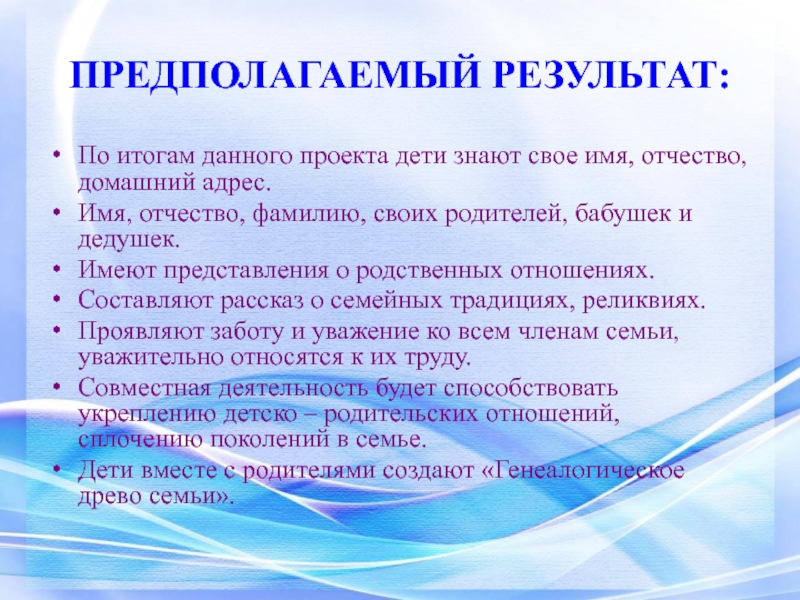 По итогам данного проекта дети знают свое имя, отчество, домашний
