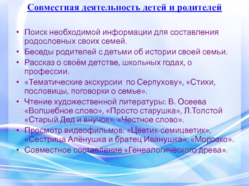 «Тематические экскурсии по Серпухову», «Стихи, пословицы, поговорки о семье».