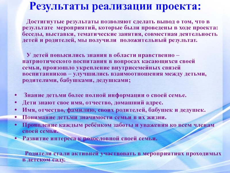 о том, что в результате мероприятий, которые были проведены в ходе проекта: беседы, выставки, тематические занятия, совместная деятельность детей и родителей, мы получили положительный результат.