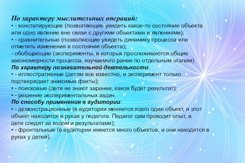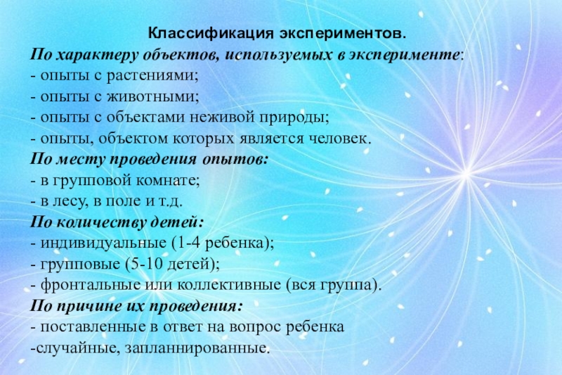- обобщающие (эксперименты, в которых прослеживаются общие
