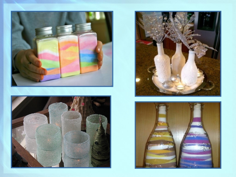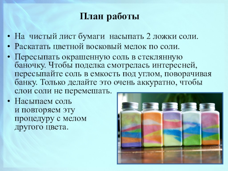 Пересыпать окрашенную соль в стеклянную баночку. Чтобы поделка смотрелась интересней, пересыпайте соль в емкость под углом, поворачивая банку. Только делайте это очень аккуратно, чтобы слои соли не перемешать.