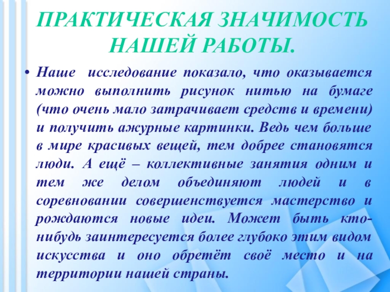 нитью на бумаге (что очень мало затрачивает средств и времени) и получить ажурные картинки. Ведь чем больше в мире красивых вещей, тем добрее становятся люди. А ещё – коллективные занятия одним и тем же делом объединяют людей и в соревновании совершенствуется мастерство и рождаются новые идеи. Может быть кто-нибудь заинтересуется более глубоко этим видом искусства и оно обретёт своё место и на территории нашей страны.