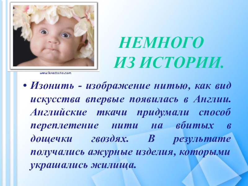 Изонить - изображение нитью, как вид искусства впервые появилась в Англии. Английские ткачи придумали способ переплетение нити на вбитых в дощечки гвоздях. В результате получались ажурные изделия, которыми украшались жилища.