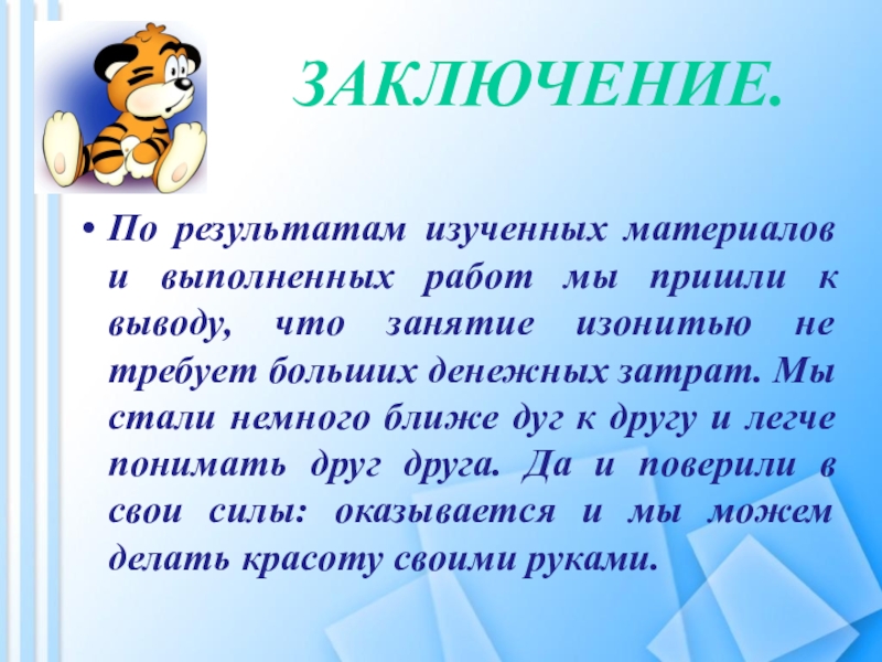 выполненных работ мы пришли к выводу, что занятие изонитью не требует больших денежных затрат. Мы стали немного ближе дуг к другу и легче понимать друг друга. Да и поверили в свои силы: оказывается и мы можем делать красоту своими руками.