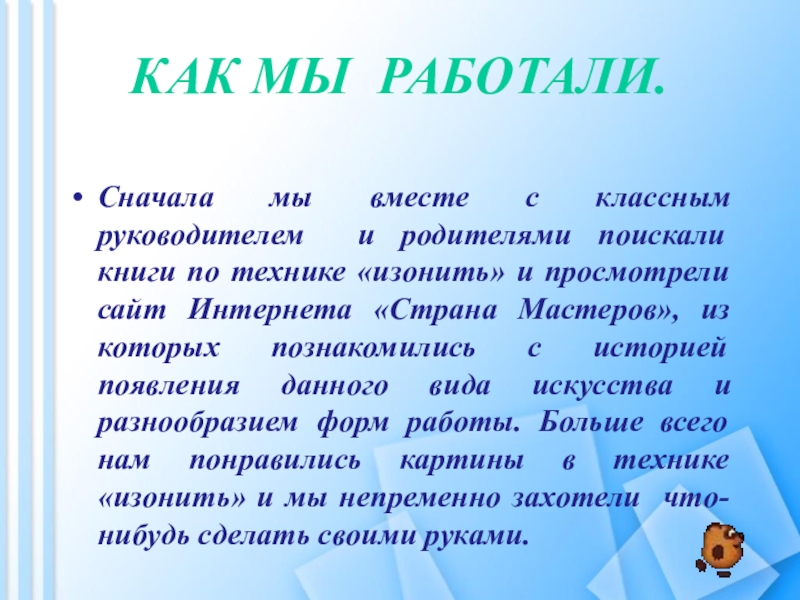 книги по технике «изонить» и просмотрели сайт Интернета «Страна Мастеров», из которых познакомились с историей появления данного вида искусства и разнообразием форм работы. Больше всего нам понравились картины в технике «изонить» и мы непременно захотели что-нибудь сделать своими руками.