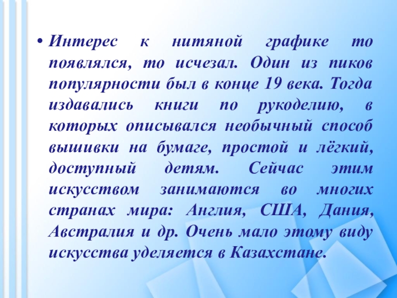 популярности был в конце 19 века. Тогда издавались книги по рукоделию, в которых описывался необычный способ вышивки на бумаге, простой и лёгкий, доступный детям. Сейчас этим искусством занимаются во многих странах мира: Англия, США, Дания, Австралия и др. Очень мало этому виду искусства уделяется в Казахстане.