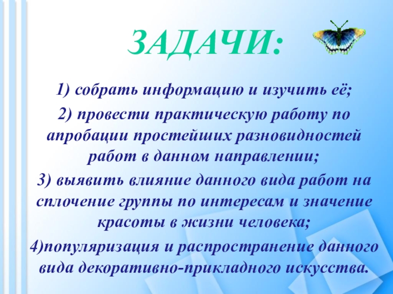 4)популяризация и распространение данного вида декоративно-прикладного искусства.