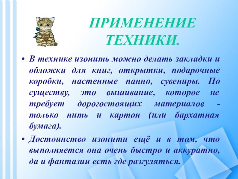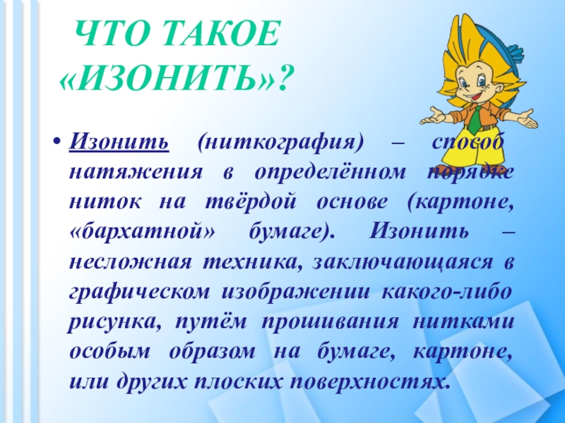 на твёрдой основе (картоне, «бархатной» бумаге). Изонить – несложная техника, заключающаяся в графическом изображении какого-либо рисунка, путём прошивания нитками особым образом на бумаге, картоне, или других плоских поверхностях.