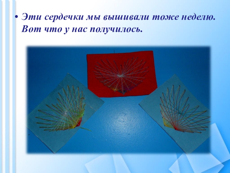Слайд 24Эти сердечки мы вышивали тоже неделю. Вот что у нас получилось.