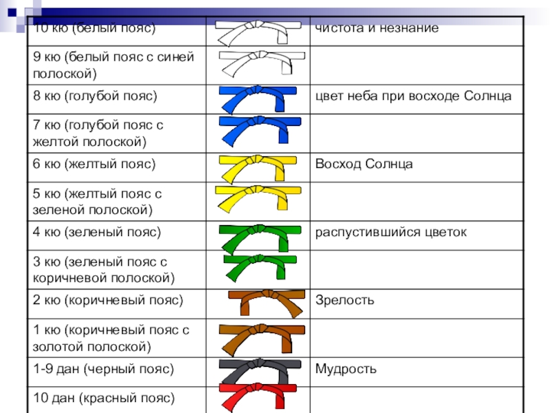 Данам соответствует чёрный пояс. На чёрный пояс нашиваются жёлтые (золотые) полоски, число которых соответствует дану (с первого по девятый). Десятому дану соответствует красный пояс.