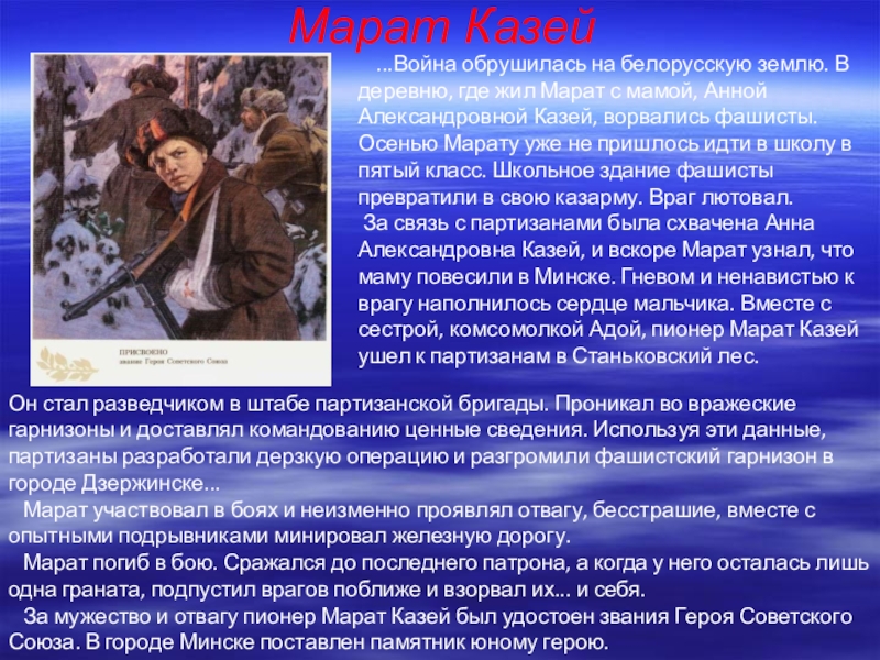 За мужество и отвагу пионер Марат Казей был удостоен звания Героя Советского Союза. В городе Минске поставлен памятник юному герою.