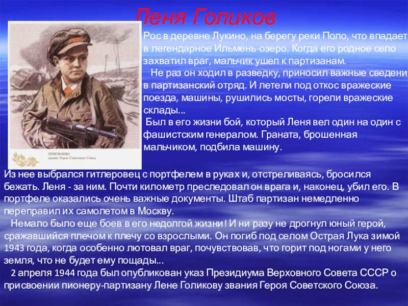 2 апреля 1944 года был опубликован указ Президиума Верховного Совета СССР о присвоении пионеру-партизану Лене Голикову звания Героя Советского Союза.