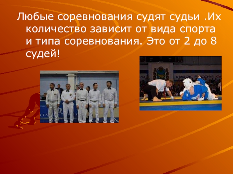 Слайд 20Любые соревнования судят судьи .Их количество зависит от вида спорта и