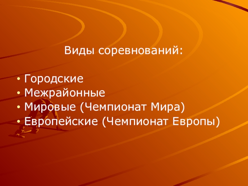 Виды соревнований:Городские МежрайонныеМировые (Чемпионат Мира)Европейские (Чемпионат Европы)