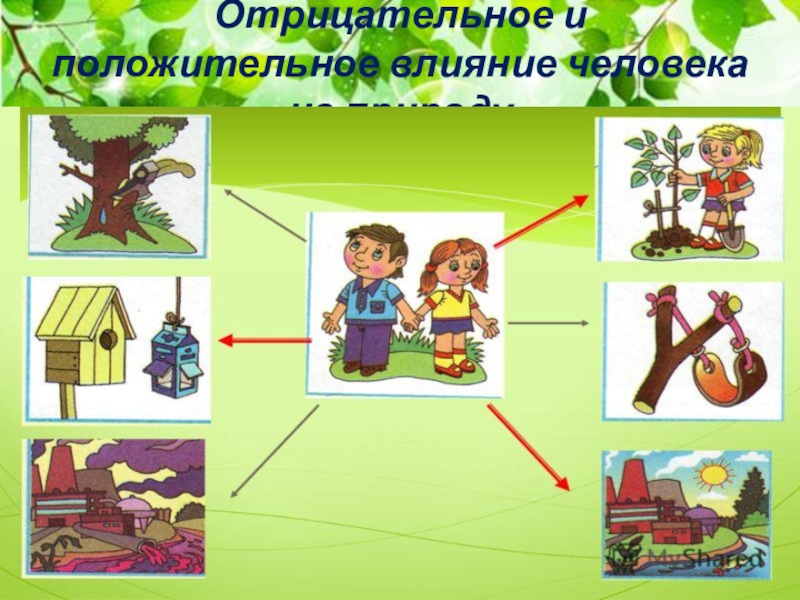 Слайд 7Отрицательное и положительное влияние человека на природу