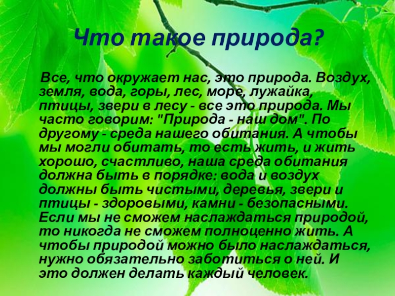 Воздух, земля, вода, горы, лес, море, лужайка, птицы, звери в лесу - все это природа. Мы часто говорим: "Природа - наш дом". По другому - среда нашего обитания. А чтобы мы могли обитать, то есть жить, и жить хорошо, счастливо, наша среда обитания должна быть в порядке: вода и воздух должны быть чистыми, деревья, звери и птицы - здоровыми, камни - безопасными. Если мы не сможем наслаждаться природой, то никогда не сможем полноценно жить. А чтобы природой можно было наслаждаться, нужно обязательно заботиться о ней. И это должен делать каждый человек.