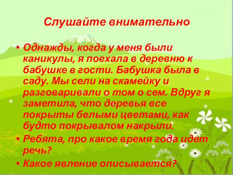 к бабушке в гости. Бабушка была в саду. Мы сели на скамейку и разговаривали о том о сем. Вдруг я заметила, что деревья все покрыты белыми цветами, как будто покрывалом накрыли.